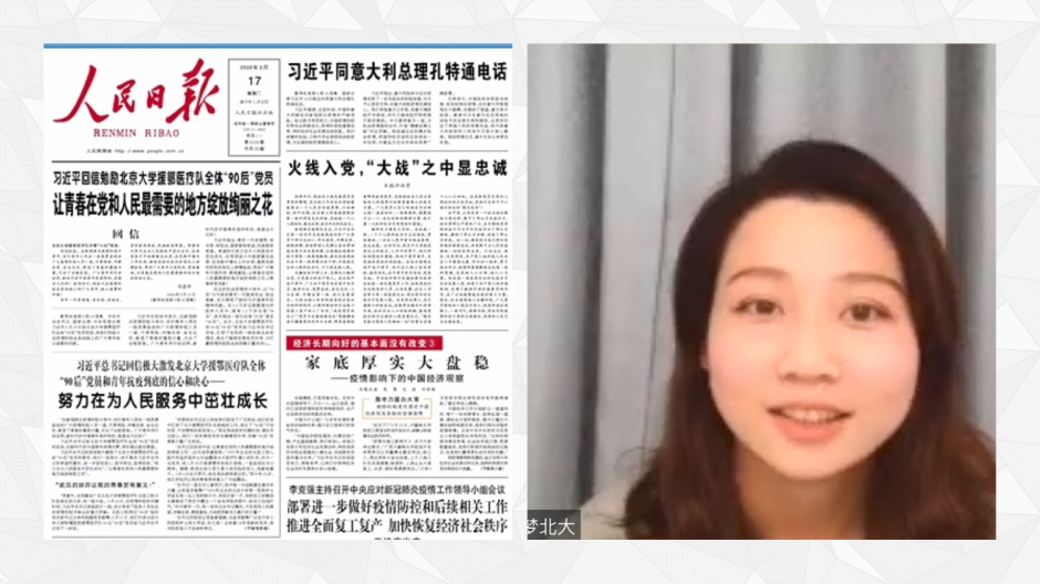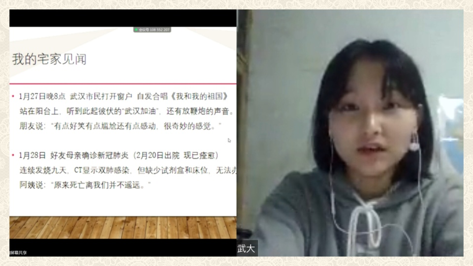 武大马院硕士生吴兆阳分享了她在武汉给医院同学送饭的难忘经历以及当她听到小区居民高喊“武汉加油”、合唱《我和我的祖国》歌声时的由衷感动。作为90后青年党员,吴兆阳号召大家要勇挑重担,报效祖国。