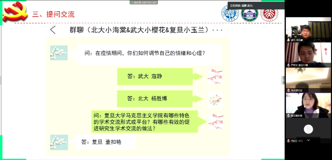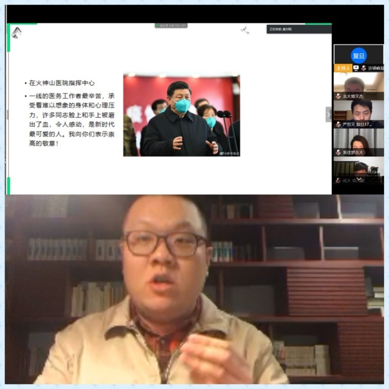 武大马院王翔同学从经济资助、心理辅导、医疗服务和建构信息平台四个方面介绍了学校在疫情期间的贴心举措。复旦马院章慧、石钻佳同学分享了建立毕业论文互助群和求职信息群的成功经验,鼓励大家保持持积极心态,清楚需求不盲从;陆婷婷、许镇峰同学分别解答了论文选题撰写技巧与支部创新性问题。随后,武大马院方蕾同学讲述了自己在黄冈参与防疫志愿工作的经历。北大马院杨胜博、彭逸飞、葛玲玲和杨玉文同学交流了居家学习期间调节心态的体会以及和导师的交流心得,号召同学们坚定信心,科学规划时间,沉下心来阅读经典。武大马院寇静同学鼓励大家加强锻炼、多和家人沟通。复旦马院董扣艳同学介绍了博士生学术工作坊、望道读书会、“小马过河”等学院特色活动,邀请大家一同参与。