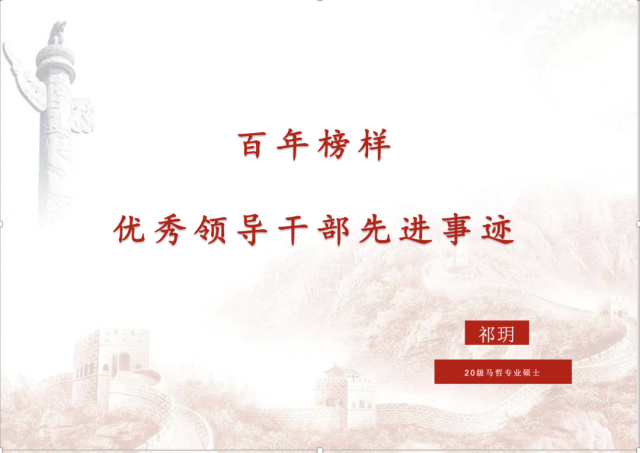 哲学系的祁玥同学以百年榜样为主题,讲述了众多优秀领导干部的先进事迹,她表示一个有前途的国家不能没有先锋,一个有希望的民族不能没有榜样,号召新时期的党员要与楷模同行、以榜样为镜,践行使命担当。