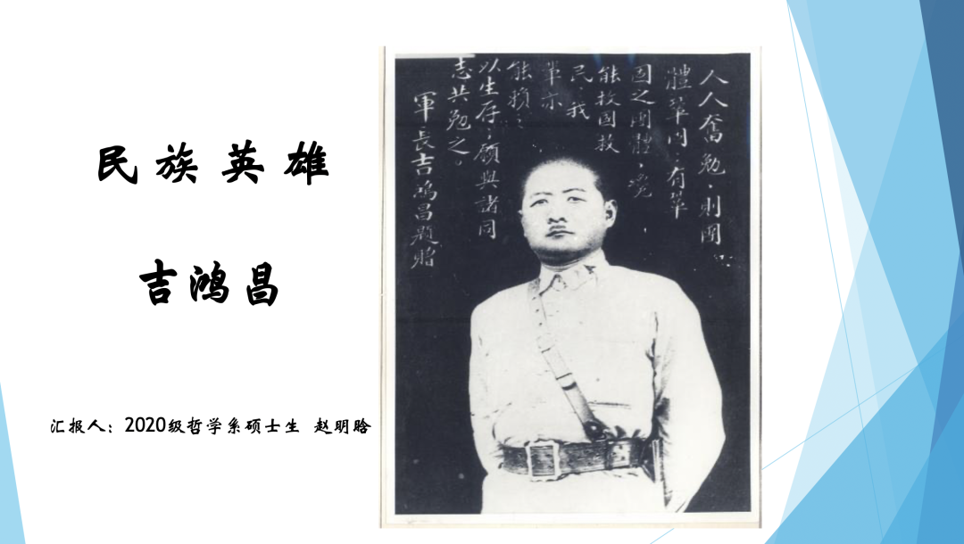 哲学系的赵明晗同学讲述了民族英雄吉鸿昌的革命岁月,为了免除下一代的苦难,甘愿牺牲自己的一切。他认为,中华民族之所以历经磨难而巍然屹立,是因为英雄们用血肉之躯铸就了坚不可摧的民族脊梁,要让英雄纪念碑屹立于人心深处。