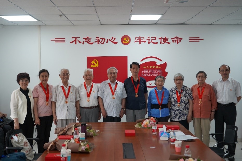 学院党委书记孙蚌珠、院长仰海峰为到场的八位老党员代表颁发“光荣在党50年”纪念章,并与老党员代表合影留念。