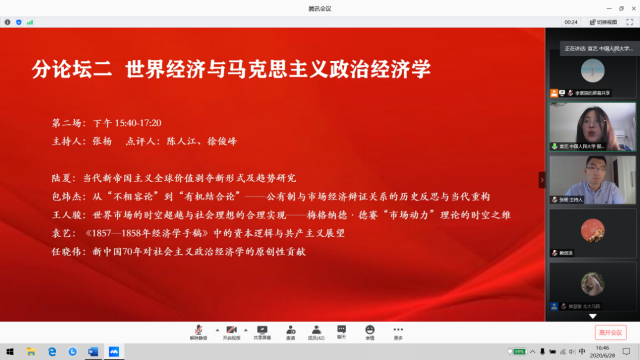 至此,上午的开幕式和主论坛圆满结束。28日下午和晚上,十个分论坛通过腾讯会议在线举行。来自全国各地的专家、青年学者与本硕博学生围绕各自主题展开了激烈而精彩的学术研讨。十个分论坛的主题分别为:1.马克思主义的世界观和方法论;2.世界经济与马克思主义政治经济学;3.国际政治与科学社会主义;4.近代以来的中国与世界;5.党建与国家治理;6.中国传统文化对当代世界治理的价值;7.国外马克思主义动态;8.新时代的思想政治教育;9.列宁主义与21世纪;10.本科生专场论坛。