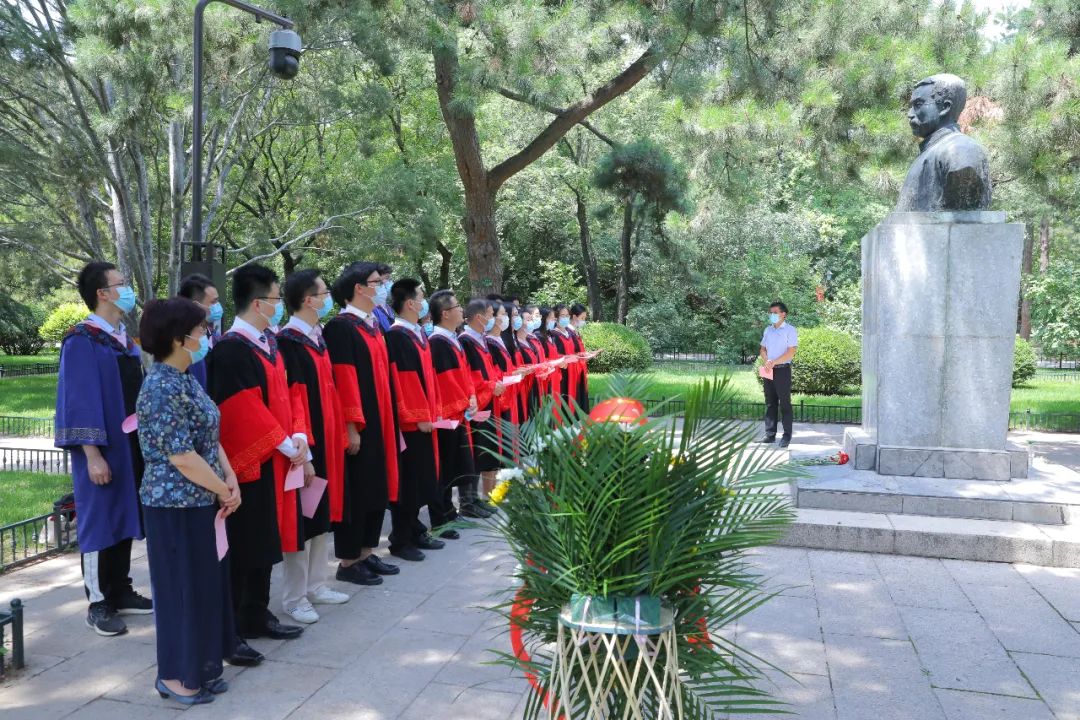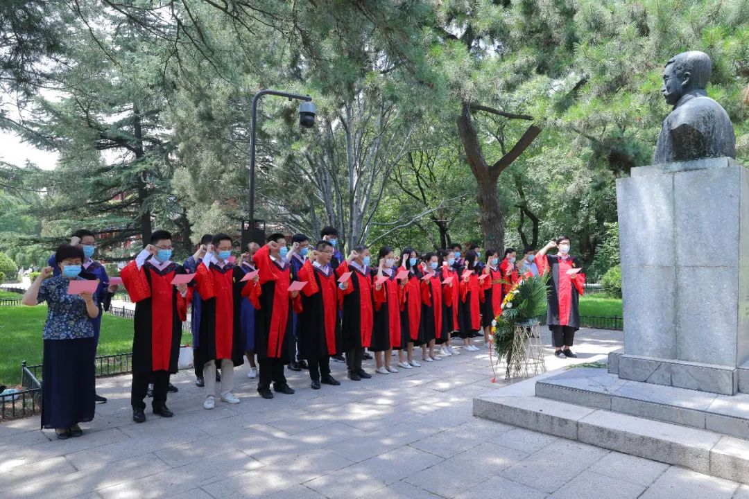 图为师生在大钊像前敬献花篮并进行毕业宣誓