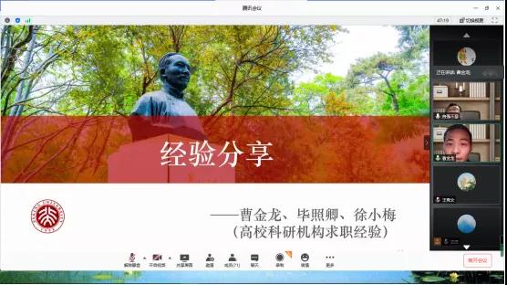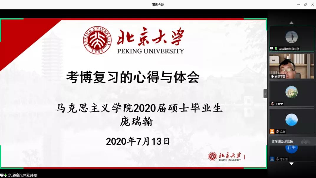 2020年7月13日,澳门电子pg游戏官网团委研究生会通过线上举办毕业生经验交流会。活动邀请了马院2020届即将赴公共部门、高校、科研机构、央企国企等领域工作学习的优秀毕业生,分享了他们求职求学的心路历程与经验感悟,并围绕同学们关心的问题答疑解惑。学院党委副书记李石生老师、团委书记罗登科老师出席会议,活动由学院研究生会李明烨、王先鹏同学主持。