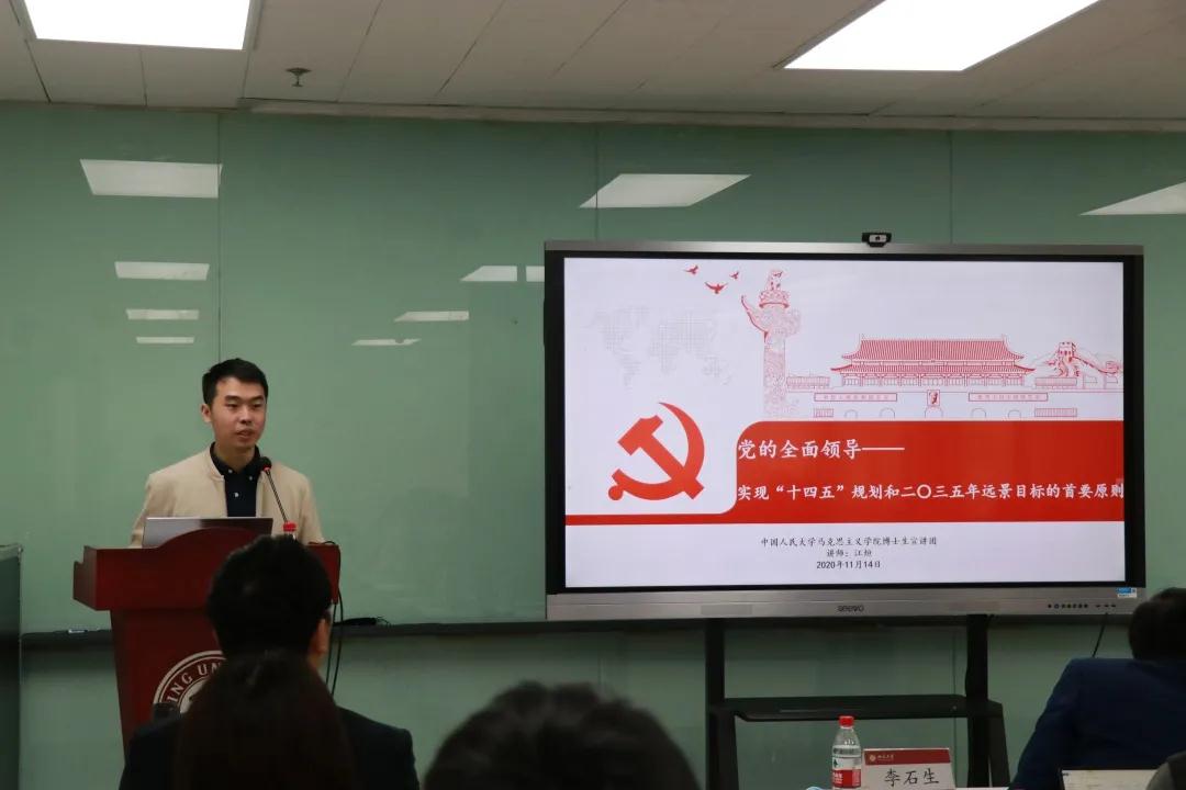 中国人民大学澳门电子pg游戏官网博士生宣讲团的江烜同学的宣讲题目为《党的全面领导——实现“十四五”规划和二〇三五远景目标的首要原则》。他认为,党的领导来自于历史和人民的选择,是防风化险稳势的根本与新时代砥砺前行的关键。坚持与完善党的领导的可行路径在于,党员要坚决做到“两个维护”,同时要健全领导体制和领导方式,并以全面从严建党管党治党促进党的领导。