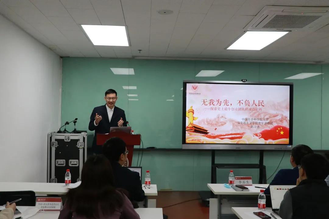 中国社会科学院大学澳门电子pg游戏官网青年讲师团赵习尧同学以《无我为先,不负人民——探索史上最牛创业团队的成功密码》为题,在回顾中共一大历史、回看中国共产党人的初心和使命的基础上,根据长征过程中发生的感人的“半条棉被”的故事以及亲身参与采集到的口述史资料,结合对新冠疫情的思考,认为中国共产党成功的密码就在于坚持党的全面领导与坚持以人民为中心。