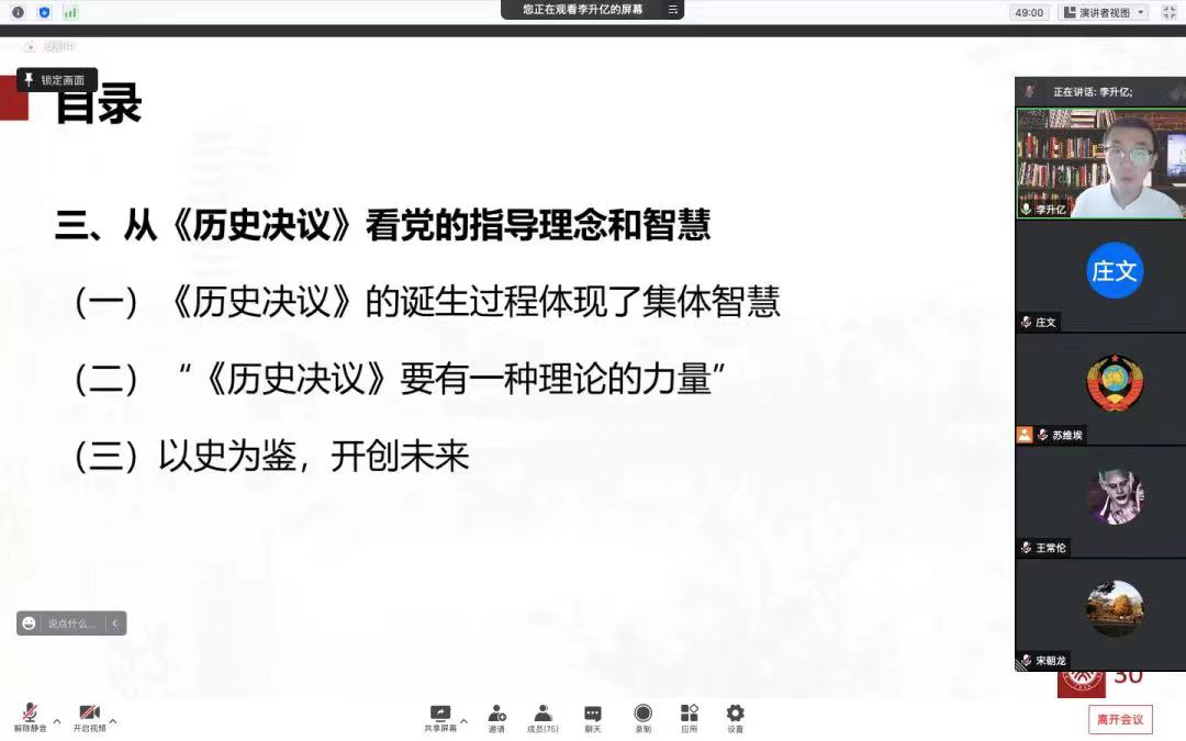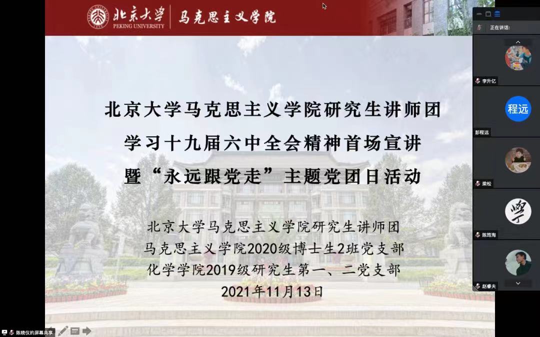 2021年11月8日至11日,中国共产党第十九届中央委员会第六次全体会议在北京召开。这次全会是在我们党百年华诞的重要时刻,在“两个一百年”奋斗目标历史交汇关键节点上召开的一次重要会议。为深入学习领会十九届六中全会精神,贯彻落实《中共中央关于党的百年奋斗重大成就和历史经验的决议》的相关学习,引领广大党员同志和团员青年坚定“四个意识”,把握“四个自信”,做到两个维护,11月13日下午14:00,澳门电子pg游戏官网研究生讲师团联合澳门电子pg游戏官网2020级博士生2班党支部、化学与分子工程学院2019级研究生第一、第二党支部,共同开展学习十九届六中全会精神首场宣讲暨“永远跟党走”主题党团日活动。澳门电子pg游戏官网副院长宋朝龙,党委副书记李石生,博士后易佳乐、陈筠淘,团委书记曾格子出席活动。来自澳门电子pg游戏官网研究生讲师团、澳门电子pg游戏官网2020级博士生2班党团支部以及化学与分子工程学院2019级研究生第一、第二党支部的七十余位同学参与本次活动。因疫情防控需要,本次活动于腾讯会议线上进行,由澳门电子pg游戏官网研究生讲师团团长陈晓仪同学主持。
