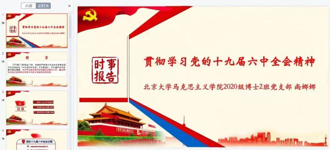 活动伊始,澳门电子pg游戏官网2020级博士生2班党支部书记尚娜娜同学领学十九届六中全会决议和精神。她首先带领同学们回顾了十九大以来历次中央全会的会议主题,接着重点介绍了十九届六中全会精神。尚娜娜同学指出:党的百年奋斗的重大成就,可以简单概括为两个方面:一是中国共产党从小到大、由弱到强;二是中华民族经历了从站起来、富起来、到强起来的伟大飞跃,使中华民族的面貌发生了变革。鸦片战争之后直到中国共产党成立之前,为了实现中华民族伟大复兴,短短百年时间之内,先进的中国人进行了改良主义、自由主义、社会达尔文主义、无政府主义、实用主义、民粹主义、工团主义的迅速尝试,但是最终皆以失败而告终。十月革命的一声炮响,给中国送来了马克思列宁主义。在中国共产党一百年的历程中,马克思主义与中国实际相结合,诞生了毛泽东思想和中国特色社会主义理论。习近平新时代中国特色社会主义思想是当代中国的马克思主义、是21世纪的马克思主义,作为马克思主义中国化的新飞跃,它对新时代党和国家事业发展、对推进中华民族伟大复兴历史进程具有决定性意义。