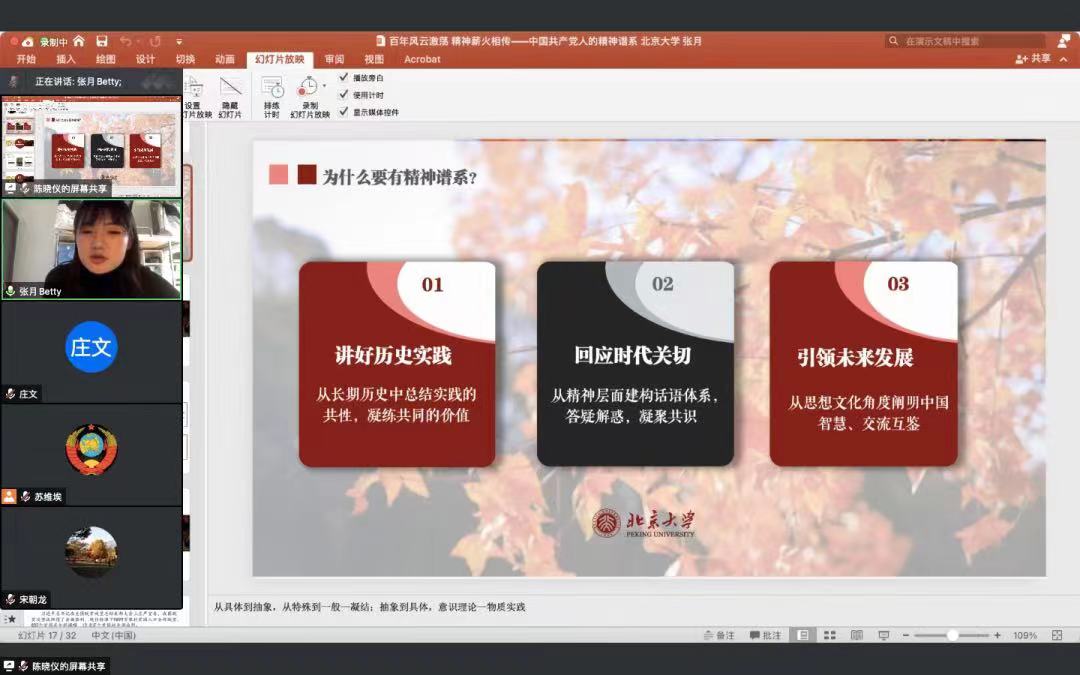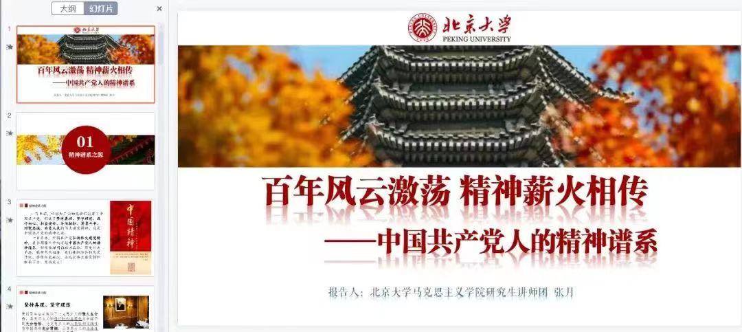 澳门电子pg游戏官网研究生讲师团讲师张月带来《百年风云激荡 精神薪火相传——中国共产党人的精神谱系》的主题宣讲。张月围绕以伟大建党精神为核心的中国共产党人的精神谱系展开分享,解读了伟大建党精神的内核,以及这一精神如何贯穿引领了中国共产党人的精神谱系,阐发了在历史特殊节点上,提出精神谱系的重要意义和特征。在宣讲中,她结合党的十九届六中全会中对“中华文化和中国精神的时代精华”的表述,从脱贫攻坚精神中解读伟大建党精神。