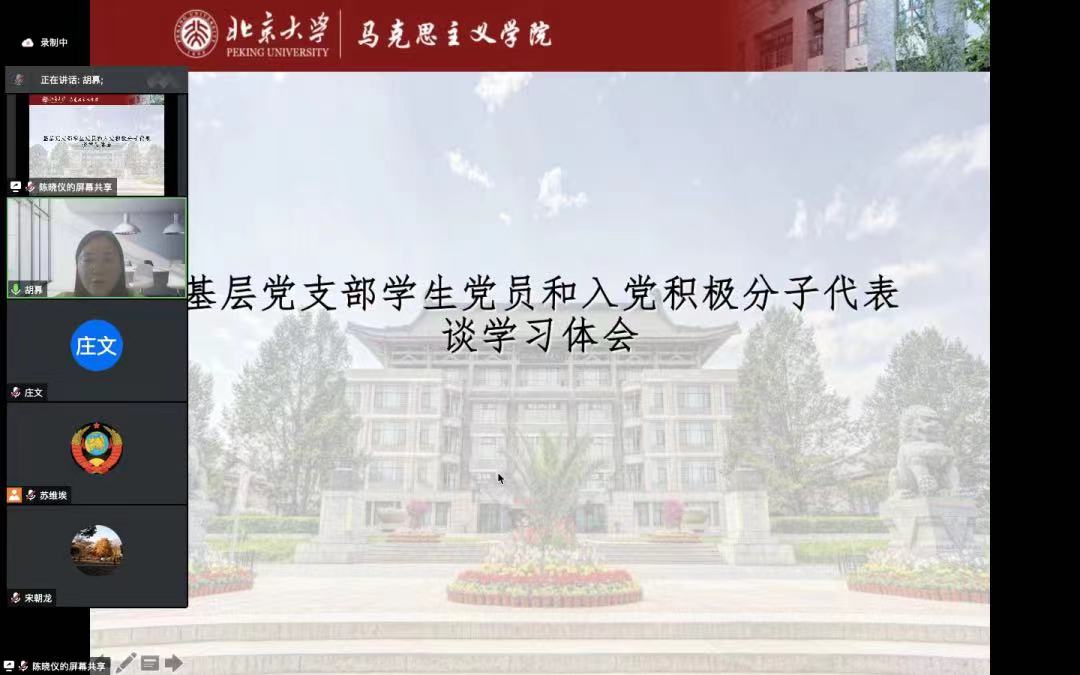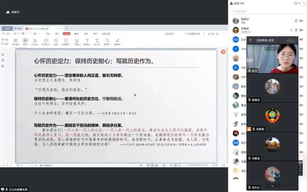 澳门电子pg游戏官网2020级博士生2班党团支部胡奡同学结合自身学习近现代史基本问题研究的专业特点,分享了她学习十九届六中全会的心得体会。她指出我们正面临着错综复杂的国际形势和艰巨繁重的国内改革发展稳定的任务,还有新冠疫情带来的新的挑战。回顾百年历史,物质生活的巨大改善、国家日新月异的发展让人感叹不已,这也更加坚定了我们的信心。作为一名澳门电子pg游戏官网的学生,她认为现在最好的为人民服务的方式就是努力学习科学的理论知识,为推动社会进步做出应有贡献。