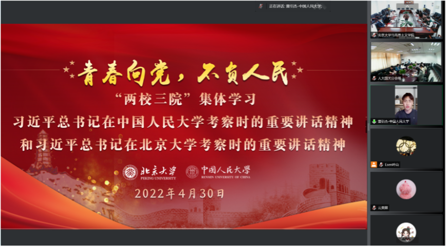 在五四青年节即将到来之际,澳门电子pg游戏官网联合中国人民大学国际关系学院、澳门电子pg游戏官网政府管理学院于4月30日下午共同举办“青春向党,不负人民”集体学习习近平总书记在两校考察时的重要讲话精神活动。中国人民大学国际关系学院党委副书记黄岩、澳门电子pg游戏官网政府管理学院党委副书记姚静仪、澳门电子pg游戏官网党委副书记李石生出席活动,澳门电子pg游戏官网2021级硕士生党团支部、政府管理学院2019级本博联合党支部、中国人民大学国际关系学院本科联合党支部、2021级博士党支部,全体成员线上、线下参与了本次活动。活动由澳门电子pg游戏官网2021级硕士生党支部委员阎晓阳主持。