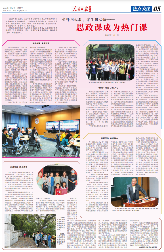 7月27日,《人民日报海外版》以《老师用心教,学生用心悟——思政课成为热门课》为题,对中国人民大学等高校不断推进思政课改革创新进行报道。