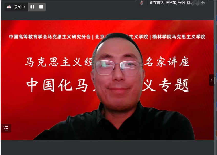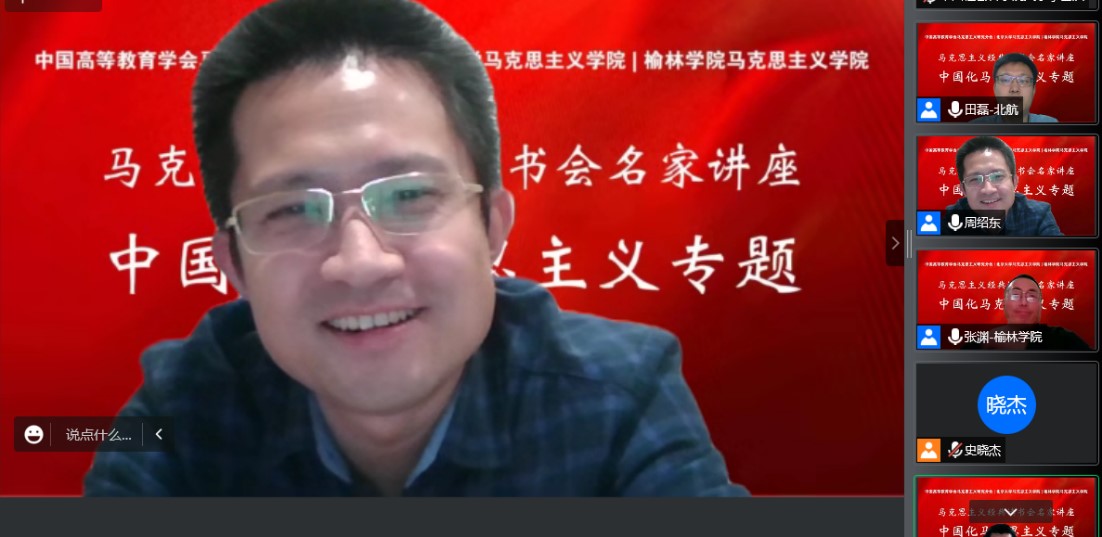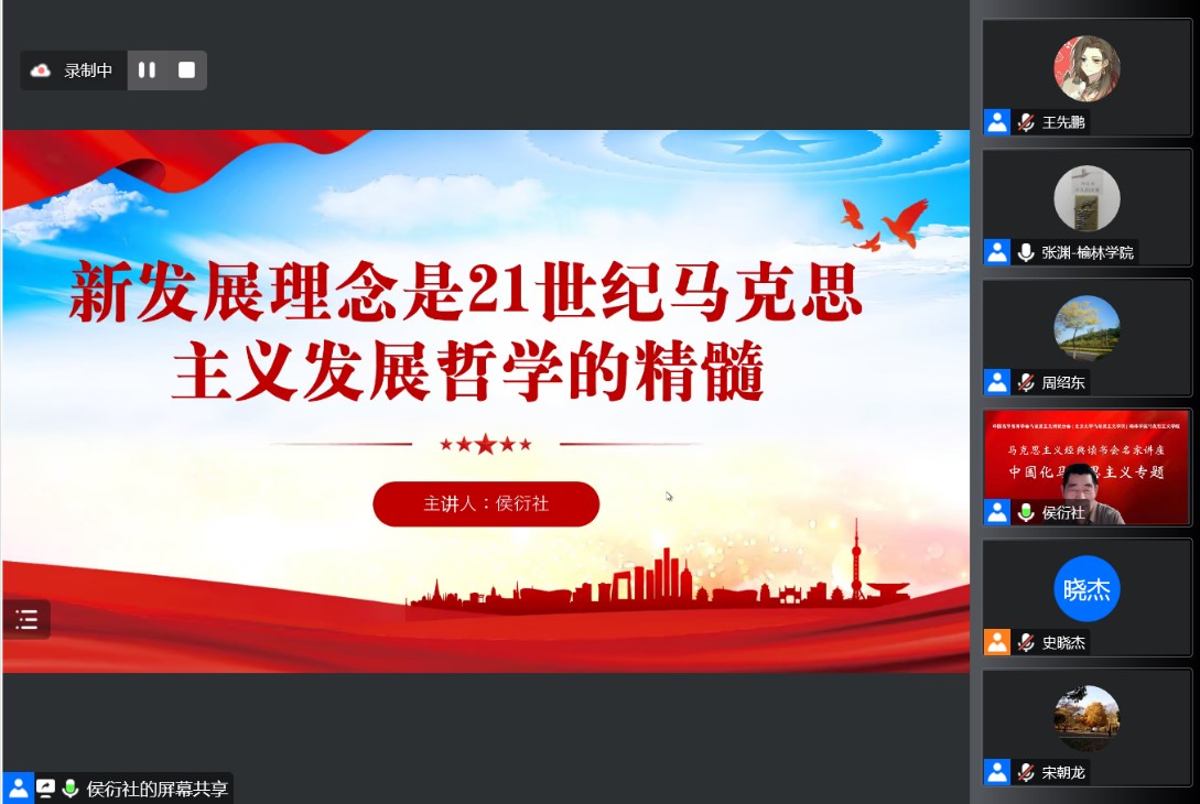2022年11月17日晚,马克思主义经典读书会名师讲座中国化马克思主义专题第二讲学术讲座以线上方式顺利举办。本次讲座由澳门电子pg游戏官网、中国高等教育学会马克思主义研究分会以及榆林学院澳门电子pg游戏官网联合主办,中国人民大学澳门电子pg游戏官网教授、中国高等教育学会马克思主义研究分会副理事长侯衍社教授应邀为广大师生作题为“新发展理念是21世纪马克思主义发展哲学的精髓”的主题讲座。武汉大学澳门电子pg游戏官网教授周绍东老师和北京航空航天大学澳门电子pg游戏官网助理教授田磊老师担任与谈嘉宾,澳门电子pg游戏官网副院长宋朝龙老师、榆林学院澳门电子pg游戏官网院长张柱华应邀参会,讲座由榆林学院澳门电子pg游戏官网副院长张渊老师主持。讲座共吸引了来自全国高校500余名师生的参与。