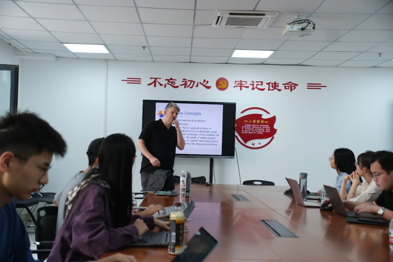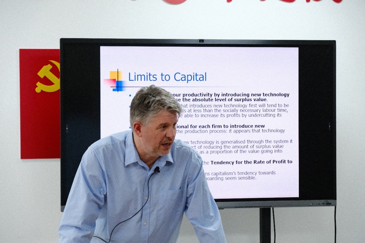 9月20日下午,保罗·布莱克里奇教授以“马克思对政治经济学的批判及其对资本主义的叙述”(Marx’s Critique of Political Economy and his Characterization of Capitalism)为题,讲授第二次课程。他首先以列宁的一本著名的小册子《马克思主义的三个来源和三个组成部分》为背景,分析马克思如何从不同的思想流派中吸收和创新,形成了批判资本主义的政治经济学和历史唯物主义。他重点讲解了斯密、马尔萨斯和李嘉图等经济学家的理论贡献与局限。接着,教授结合《资本论》具体阐述了社会分工、商品二因素、劳动二重性、价值形式、商品拜物教等概念。他强调资本主义在本质上是一种获取剩余价值的新的剥削形式。在此基础上,教授梳理了资本主义发展的历史,考察了霍布森、希法亭、考茨基、卢森堡、列宁、布哈林等理论家对帝国主义的叙述。此外,教授还针对同学们提出的资本主义经济危机的具体形式、帝国主义在当代的发展等问题作出进一步阐释。