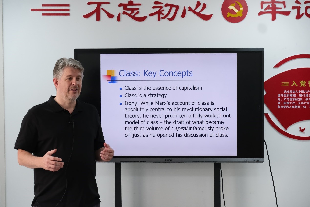 9月27日下午,保罗·布莱克里奇教授以“社会基础:马克思的阶级概念”(The Social Base: Marx’s Conception of Class)为题,讲授第三次课程。教授指出,阶级是马克思社会理论的核心。阶级首先是一个历史概念,分析阶级必须联系着人类物质生产过程的变迁来进行。据此,教授回顾了新石器革命(Neolithic Revolution)、城市革命(Urban Revolution)等事件与阶级形成和演化的关系,强调自原始公有制解体后,阶级斗争构成历史上各种生产方式的本质。接着,教授具体分析了资本主义社会的阶级关系。他解释了马克思对商品、货币、阶级、国家等概念的挖掘,认为阶级具有隐蔽性和无处不在性。之后,教授回应了西方学界对马克思阶级理论的质疑。他提出,现代社会学理论倾向于将阶级简化为各种身份之一,而马克思主义者认为这是错误的,因为阶级是客观的社会事实。同时,个体作为阶级的联合是其系统性地挑战资本主义生产方式、寻求资本主义替代道路的唯一策略。在授课过程中,教授还就师生提出的“总体性”分析方法、阶级与阶级意识的关系、工人阶级内部的阶层分化等问题作了进一步解答。