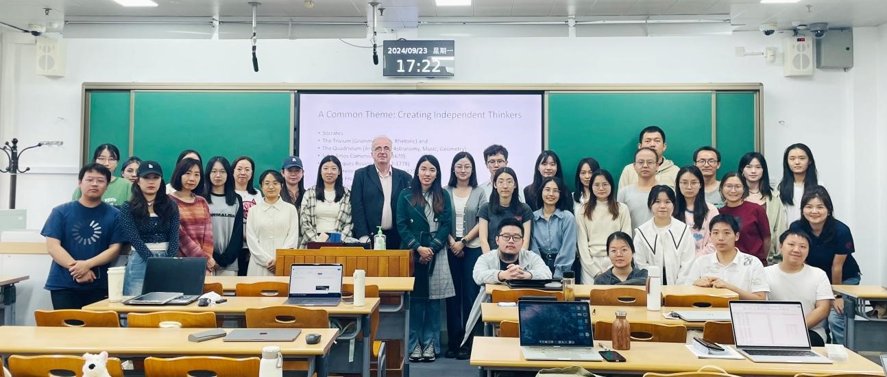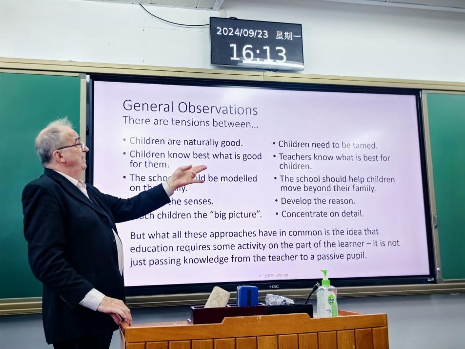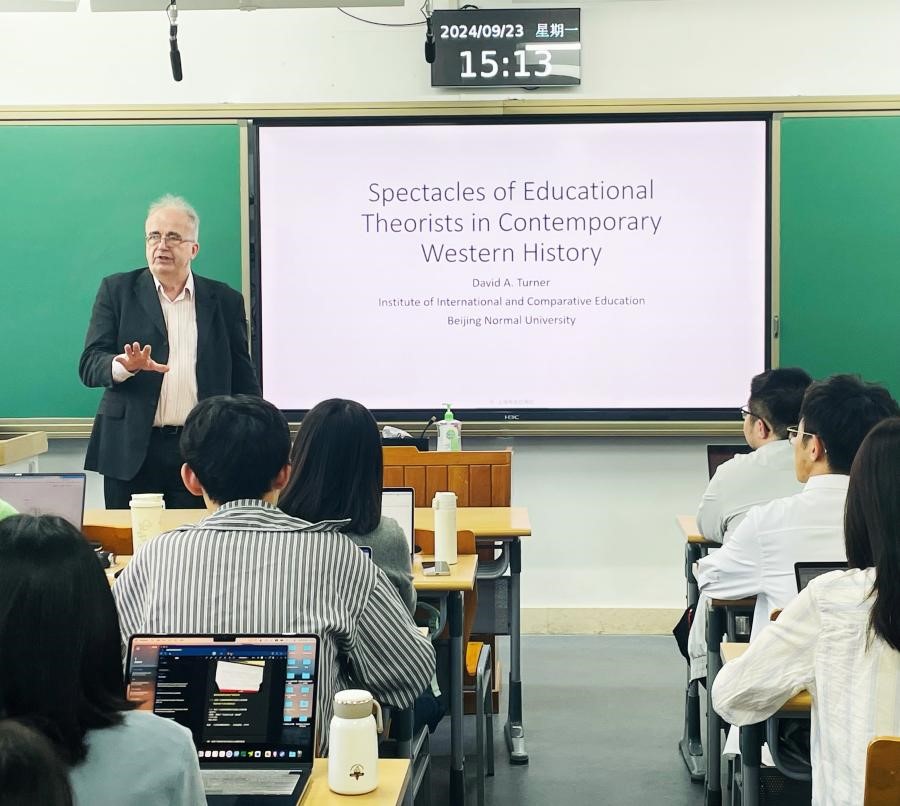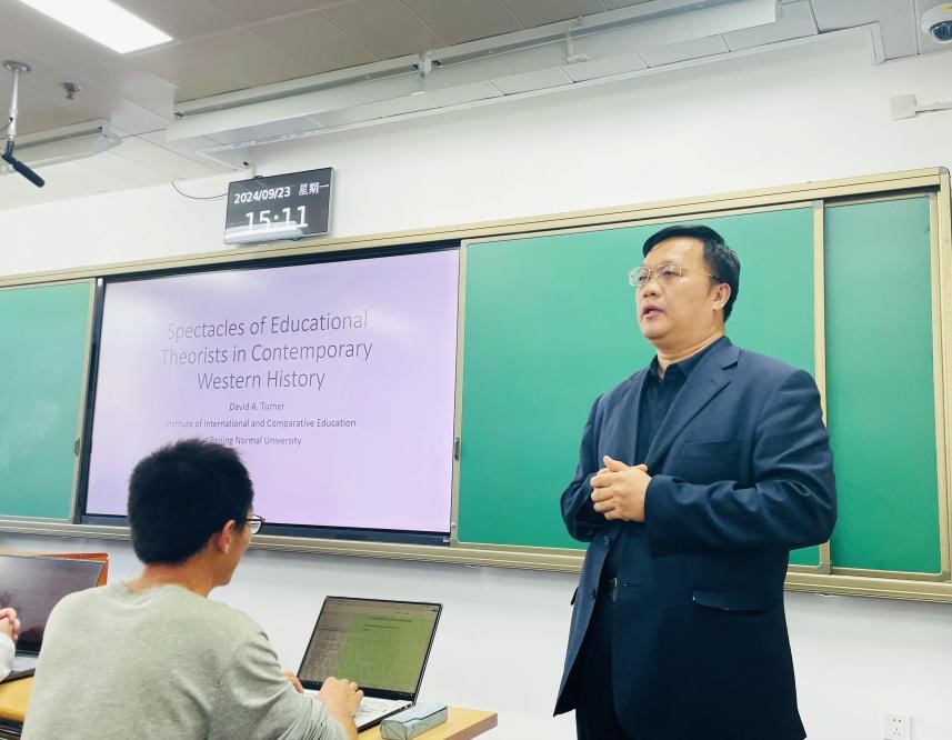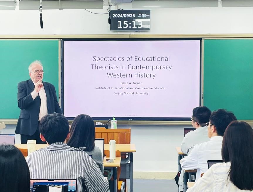 2024年9月23日下午15:10—17:30,英国南威尔士大学教育学名誉教授、 北京师范大学国际与比较教育研究院教授David A. Turner在澳门电子pg游戏官网第三教学楼304教室为电子pg游戏官网师生作题为“当代西方教育理论家的理论观点纵览”(Spectacles of Educational Theorists in Contemporary Western History)的专题学术讲座,讲座由澳门电子pg游戏官网副院长宇文利教授主持,40余名博士研究生到场聆听,现场座无虚席。