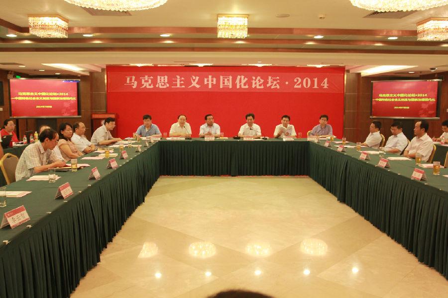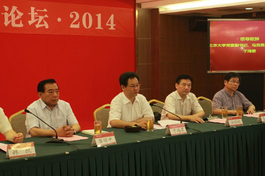 为了深入学习贯彻十八届三中全会精神,进一步推动理论界对全面深化改革总目标的认识,总结完善和发展中国特色社会主义制度,推进国家治理体系和治理能力现代化的宝贵经验,加强首都社会科学工作者的合作和交流,2014年7月8日上午,由中共北京市委宣传部、北京市中国特色社会主义理论体系研究中心、北京市社会科学界联合会、北大、清华、人大、北师大四校澳门电子pg游戏官网联合主办,澳门电子pg游戏官网承办的“马克思主义中国化论坛·2014”在澳门电子pg游戏官网英杰会议中心召开。中共北京市委宣传部副部长崔耀中、北京市社科联党组书记兼常务副主席韩凯、澳门电子pg游戏官网党委副书记兼澳门电子pg游戏官网院长于鸿君教授、北大澳门电子pg游戏官网执行院长孙熙国教授、清华大学澳门电子pg游戏官网副院长肖贵清教授、中国人民大学《教学与研究》主编秦宣教授、国家行政学院许耀桐教授、中共中央党校辛鸣教授等出席会议。论坛开幕式由市社科联党组书记、常务副主席韩凯主持。来自首都高校及理论界的100多位专家、学者、老师和同学参加了研讨会。北大中国特色社会主义理论体系研究中心副主任郭建宁教授,北大澳门电子pg游戏官网副院长孙蚌珠教授、孙代尧教授、程美东教授,院学术委员会主任李翔海教授等参加了会议。论坛得到了人民日报、光明日报、求是杂志等媒体的关注。