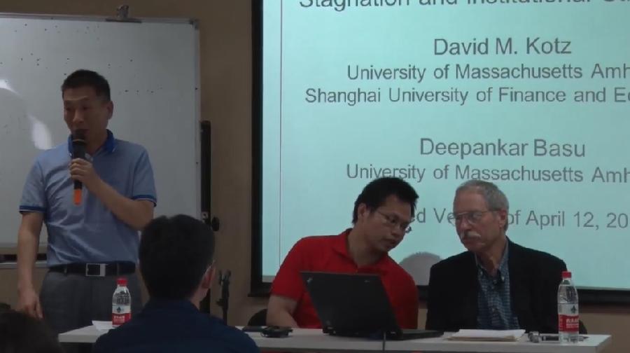 第二场大卫•科兹教授讲座的主题是“有关停滞的争论:为什么美国经济增长得如此缓慢”。他首先介绍了欧美国家2008年经济危机以后恢复乏力的现状,并介绍了主流经济学家对这次经济停滞的多种讨论。科兹教授运用马克思主义的方法,形成了新自由主义积累社会结构的理论,基于经济制度结构的变化对宏观经济的影响,并做了具体的数据分析,说明了美国自2008年以来的经济停滞的原因。通过分析,他认为,导致美国经济停滞的主要原因有:当前的技术对生产效率的推动有限、人口增长缓慢、教育经费的增长与质量下降、不平等以及政府债务等。
