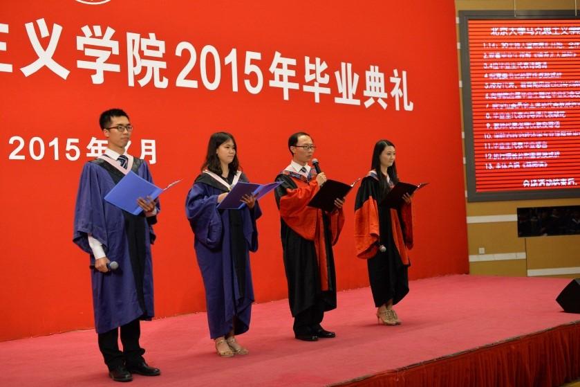 典礼在雄壮的国歌声中拉开了序幕。毕业班的杜磊、肖潇、朱竞雅、易佳乐四位同学深情地朗诵了他们倾心创作的《惜别燕园》,分享了他们在北大马院几年学习的思想升华,表达了他们对于北大、对于学院的感恩之情,畅想了对于美好未来的憧憬。
