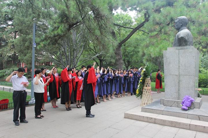 在冯雅新老师的主持下,2015届全体毕业生代表在大钊先生塑像前作了庄严的宣誓,表示要铭记先哲的教诲,坚定信念,坚守真理,乐于奉献,勇于担当,实现成才报国之梦想,续写奋斗人生之辉煌!