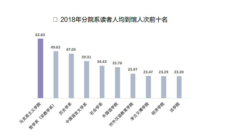 “在马学马,在马读马”,已经成为澳门电子pg游戏官网读者的自觉行动。数据显示,马院读者人均到学校图书馆的次数接近63次,比第二名哲学系人均约50次多了13次,更大幅领先其它院系(见下图)。