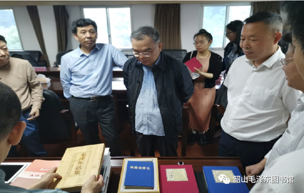 在韶山毛泽东图书馆,省韶山管理局党委书记、局长高扬先等陪同考察、调研座谈。馆长谢锡光首先向专家学者详细介绍了馆整体情况和近年来征集、研究、数字化等工作情况。专家学者实地查看了馆藏珍品库房,体验了3D数字化成果。在随后的调研座谈会上,双方就如何利用韶山毛泽东图书馆这个优势平台,展开合作,共同打造有影响力的学术品牌展开了热烈讨论。高扬先表示,韶山管理局正策划开展暑期高端红色研学活动,运用好全局的资源,通过邀请国家顶级高校相关专业的研究生博士生来韶山,进行研学、游学、专业研讨等活动,加强革命文物的保护和利用,以青年学者的研究成果影响更多的年轻人了解我们党的历史,知史爱党、知史爱国。顾海良充分肯定了韶山毛泽东图书馆在收集、利用文献方面所做的大量工作,他高度赞同、支持开展高端红色研学活动,表示一定广泛动员广大青年学者参与进来。并希望双方在课题研究、学术论坛等方面进一步加强交流合作,真正发挥好韶山毛泽东图书馆作为泽东思想研究资料中心的作用。